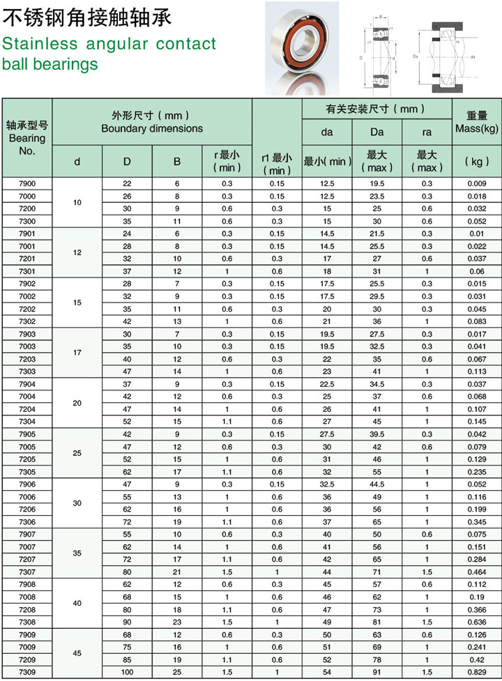 440不銹鋼角接(jie)(jie)觸球軸(zhou)承(cheng)可同時承(cheng)受徑向負荷和(he)(he)軸(zhou)向負荷。能在(zai)較高的(de)(de)轉速下工作。接(jie)(jie)觸角越大,軸(zhou)向承(cheng)載能力越高。接(jie)(jie)觸角為(wei)徑 向平(ping)面(mian)內(nei)球和(he)(he)滾道的(de)(de)接(jie)(jie)觸點連線(xian)與軸(zhou)承(cheng)軸(zhou)線(xian)的(de)(de)垂(chui)直線(xian)間(jian)的(de)(de)角度(du)。高精(jing)度(du)和(he)(he)高速軸(zhou)承(cheng)通(tong)常(chang)取(qu)15度(du)接(jie)(jie)觸角。在(zai)軸(zhou)向力作用下,接(jie)(jie)觸角會增大。